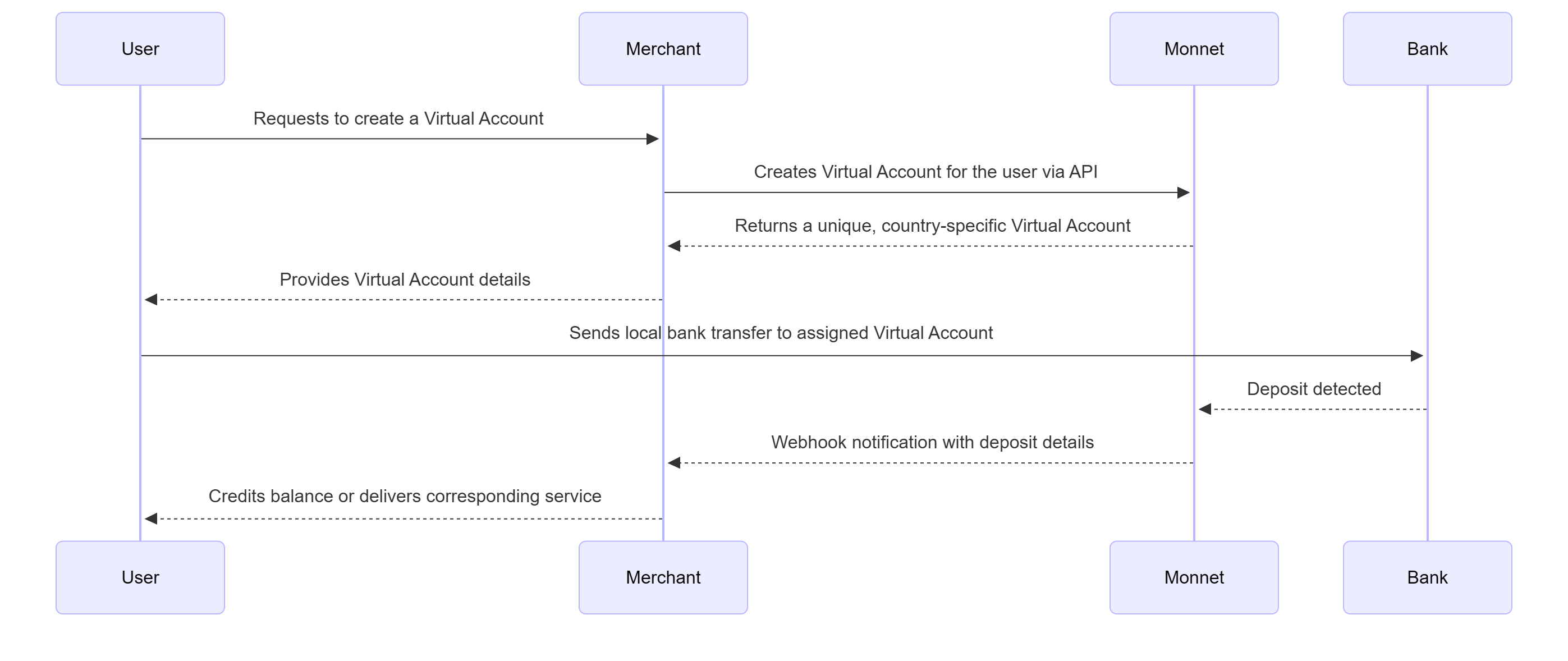 3.- Monnet returns a unique, country-specific Virtual Account to the Merchant.